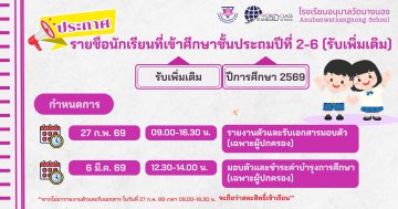 ประกาศรายชื่อนักเรียนที่เข้าศึกษาชั้นประถมปีที่ 2-6 (รับเพิ่มเติม) ปีการศึกษา 2569