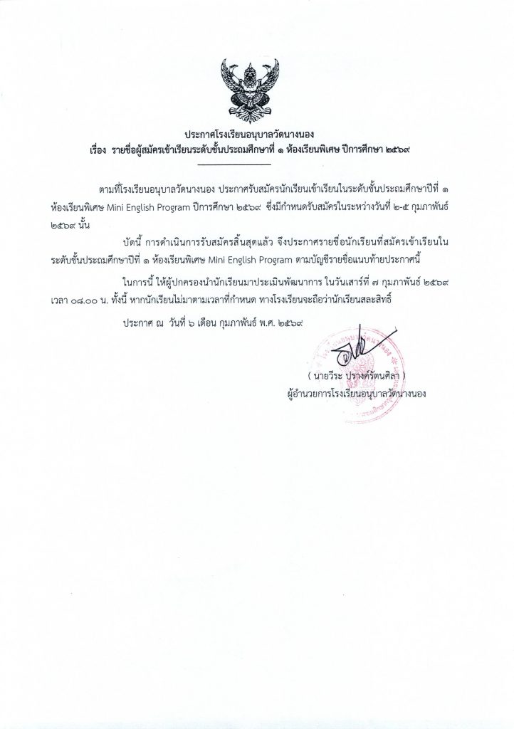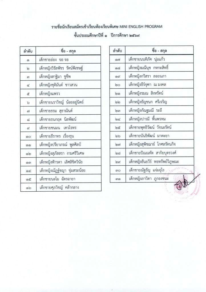 ประกาศรายชื่อผู้มีสิทธิ์สอบความรู้และสัมภาษณ์ห้องเรียนพิเศษด้านภาษาอังกฤษ MEP สำหรับนักเรียนชั้น ป. 1 ปีการศึกษา 2569 6 กุมภาพันธ์ 20266 กุมภาพันธ์ 2026 admin ข่าวประชาสัมพันธ์/ประกาศ/ข่าวสาร FacebookFacebookXTwitterLINELine จำนวนผู้เช้าชม : 2 FacebookFacebookXTwitterLINELine