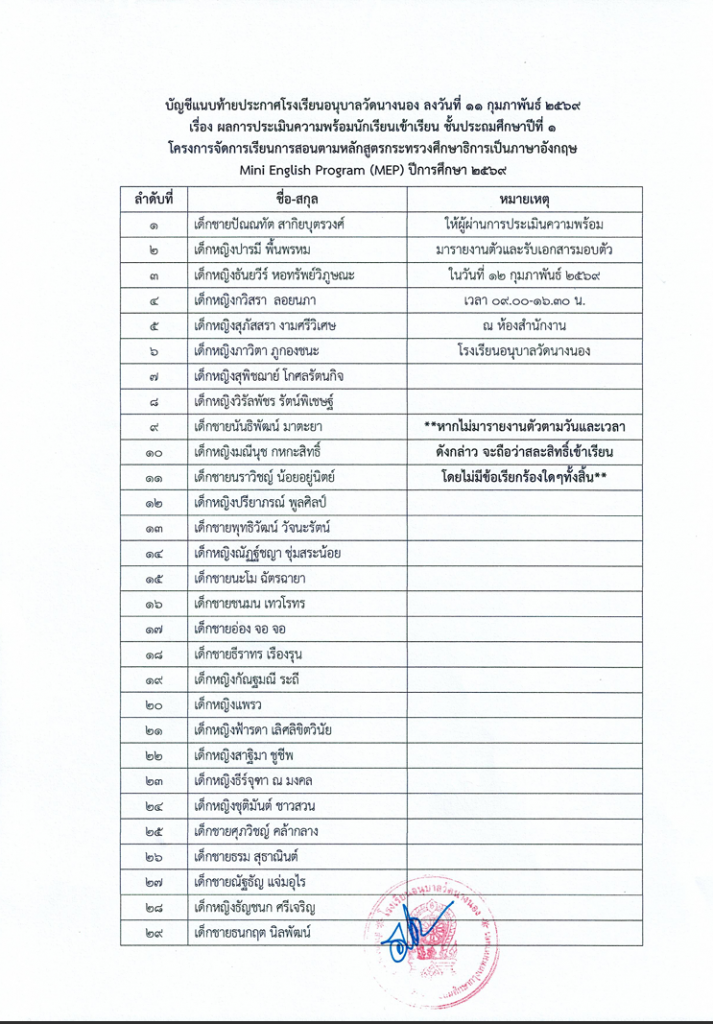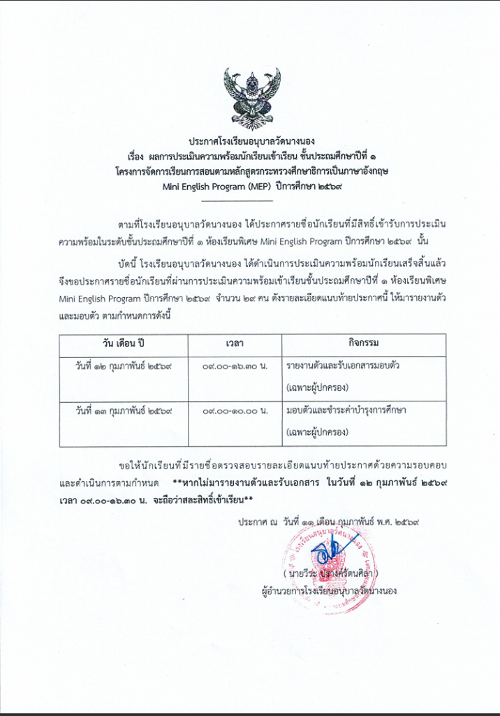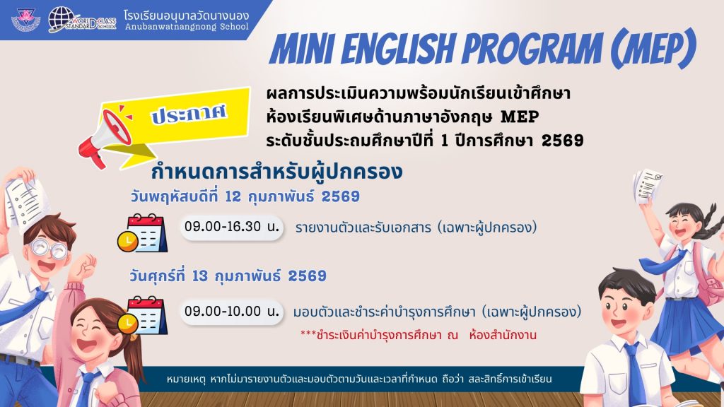 ประกาศ ผลการประเมินความพร้อมนักเรียนเข้าศึกษา ห้องเรียนพิเศษด้านภาษาอังกฤษ MEP ระดับชั้นประถมศึกษาปีที่ 1 ปีการศึกษา 2569 11 กุมภาพันธ์ 202611 กุมภาพันธ์ 2026 admin ข่าวประชาสัมพันธ์/ประกาศ/ข่าวสาร FacebookFacebookXTwitterLINELine จำนวนผู้เช้าชม : 8 FacebookFacebookXTwitterLINELine
