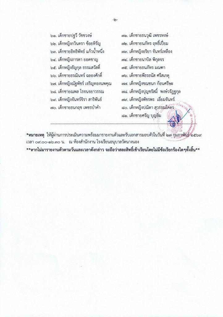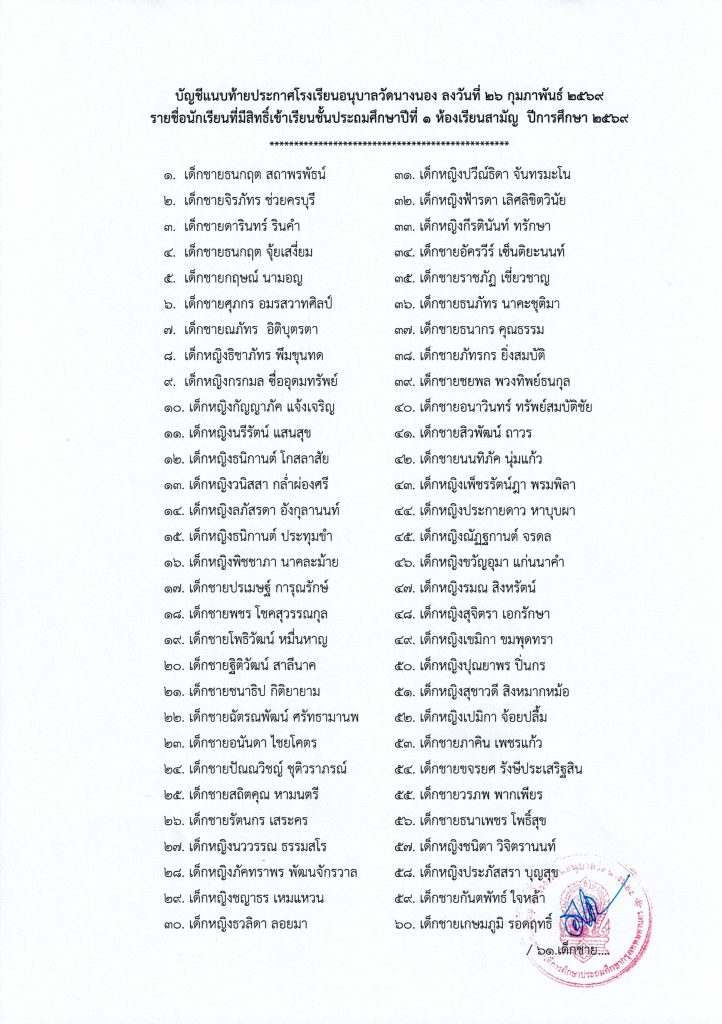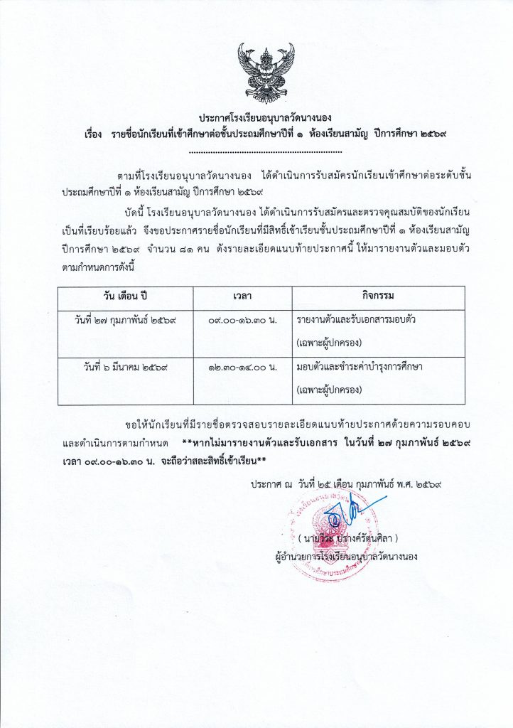 ประกาศ โรงเรียนอนุบาลวัดนางนอง รายชื่อนักเรียนที่เข้าศึกษาชั้นประถมศึกษาปีที่ 1 ห้องเรียนสามัญ ปีการศึกษา 2569 25 กุมภาพันธ์ 202625 กุมภาพันธ์ 2026 admin ข่าวประชาสัมพันธ์/ประกาศ/ข่าวสาร FacebookFacebookXTwitterLINELine จำนวนผู้เช้าชม : 75 FacebookFacebookXTwitterLINELine