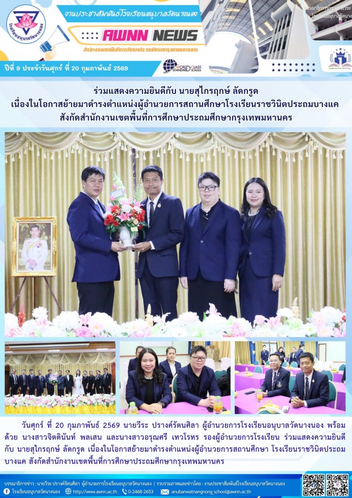 โรงเรียนอนุบาลวัดนางนอง ขอแสดงความยินดี แก่นักเรียนที่มีผลการทดสอบทางการศึกษา ระดับชาติขั้นพื้นฐาน (O-Net) ชั้นประถมศึกษาปีที่ 6 ปีการศึกษา 2568 ที่มีคะแนนสูงสุดในกลุ่มสาระการเรียนรู้ภาษาไทย ภาษาอังกฤษ คณิตศาสตร์และวิทยาศาสตร์ 11 มีนาคม 202611 มีนาคม 2026 การพัฒนาคุณภาพการศึกษา, ข่าวประชาสัมพันธ์/ประกาศ/ข่าวสาร FacebookFacebookXTwitterLINELine จำนวนผู้เช้าชม : 40 Fa […] admin11 มีนาคม 2026