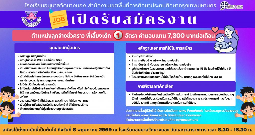 เปิดรับสมัครงาน ตำแหน่งลูกจ้างชั่วคราว พี่เลี้ยงเด็ก 1 อัตรา ค่าตอบแทน 7,300 บาทต่อเดือน 23 เมษายน 202623 เมษายน 2026 admin ประกาศข่าวรับสมัคร FacebookFacebookXTwitterLINELine จำนวนผู้เช้าชม : 32 FacebookFacebookXTwitterLINELine